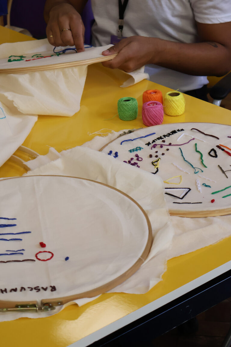 Todos os materiais são oferecidos pelo Educativo e cada participante da oficina leva para casa sua produção em bordado livre.