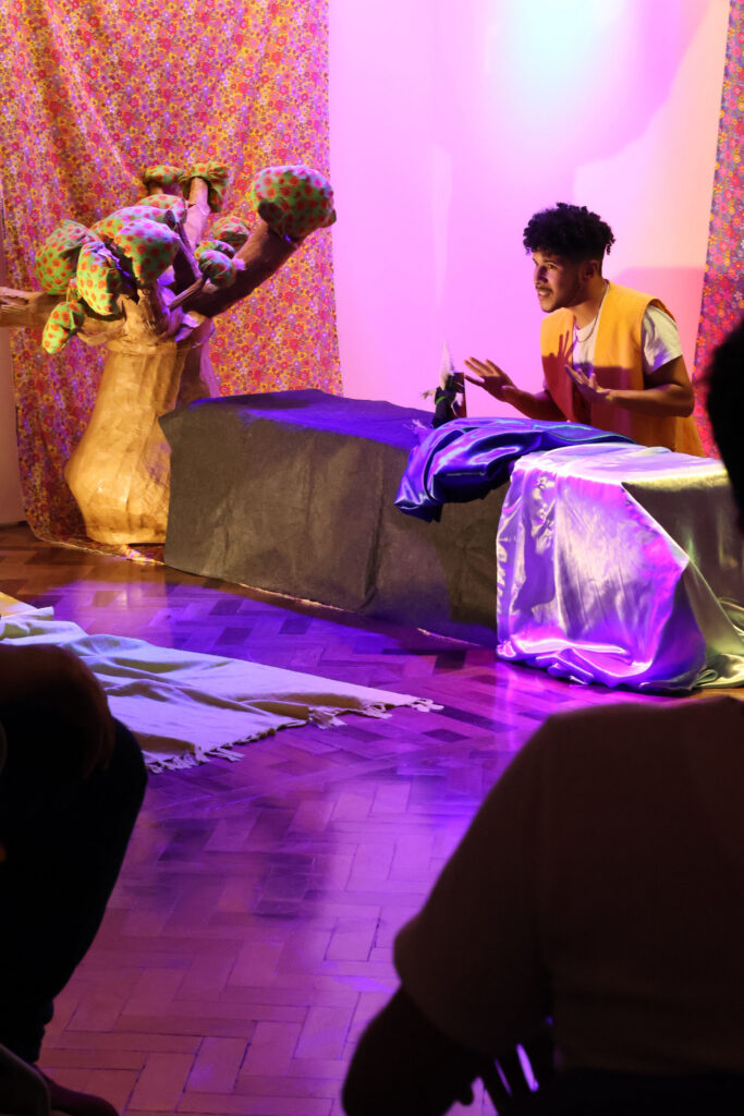 Karingana wa Karingana é a expressão que os Rongas, de Moçambique, utilizam para iniciar a contação de histórias tradicionais. A partir dessa inspiração, Chica Reis apresenta uma narração artística que celebra os saberes dos povos negros por meio de fábulas africanas e afro-brasileiras. São relatos que revelam a riqueza da herança afro-diaspórica, dando vida a animais personificados e carregando ensinamentos transmitidos de geração em geração. Em uma roda ancestral que une ludicidade e oralidade, crianças, jovens, adultos e idosos se encontram para compartilhar e ouvir afro-histórias que ecoam o conhecimento das mais velhas e fortalecem vínculos comunitários.