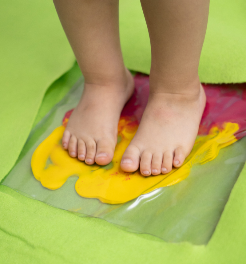 Nessa experiência sensorial voltada para bebês, as cores se transformam por meio do toque. Sobre um painel transparente, mãos e pés desenham e se misturam com as tintas. Através do movimento e da curiosidade, as crianças descobrem novas cores e texturas sem se sujar, explorando o encanto da transformação das cores em movimento.