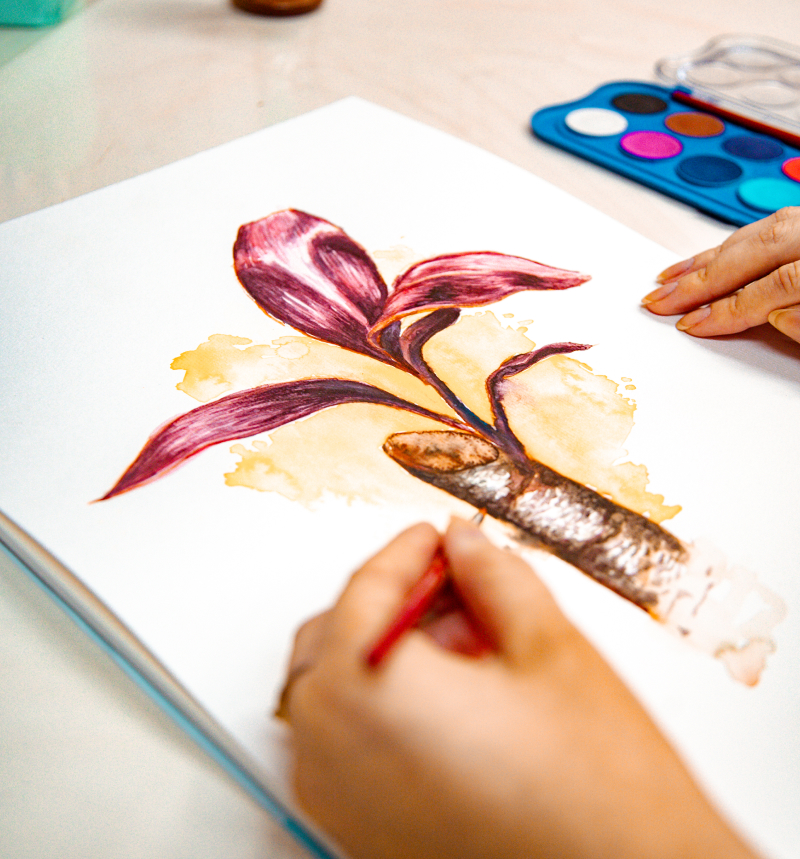 Crianças e adolescentes observam plantas vivas para realizar pinturas com aquarela. A partir da observação de folhas, flores e caules, exploram composição e a simbologia desses elementos naturais, desenvolvendo atenção, sensibilidade e expressão visual.