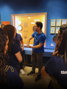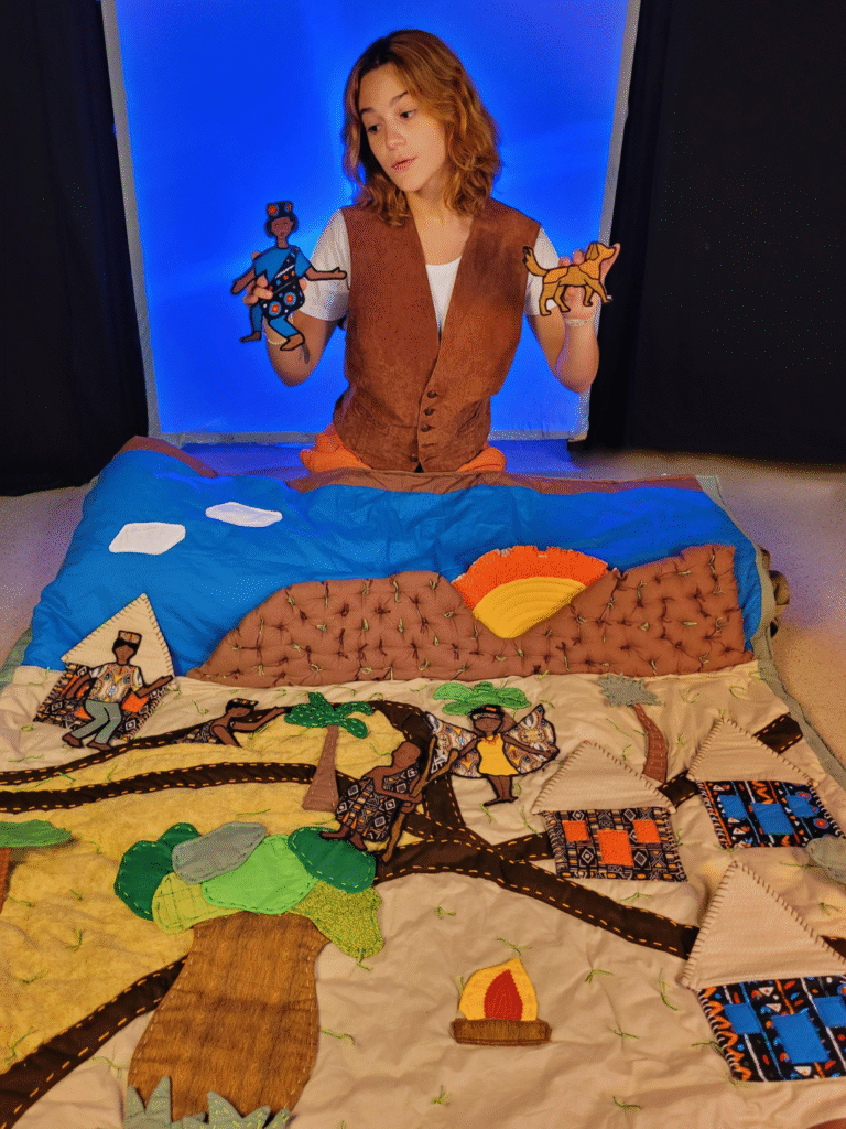 Mediação acessível que transforma o espaço do Educativo em uma cena viva e sensorial. A atividade foi especialmente pensada para atender diferentes formas de percepção e mobilidade, utilizando recursos táteis e visuais para narrar a história do deus Hermes — desde a artimanha com as ovelhas de Apolo até a criação e entrega da lira. Durante o percurso, colunas evocam a arquitetura do CCBB, enquanto objetos com diferentes texturas formam os caminhos percorridos. Hermes surge com suas sandálias aladas, e Zeus aparece entre trovões e nuvens. O público é convidado a cuidar das ovelhas e caminhar com os educadores pelos passos de Hermes até o fim da história, numa experiência coletiva e inclusiva.