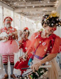 Já pensou como seria viver uma história em quadrinhos na vida real? Em janeiro, o CCBB Educativo – Lugares de Culturas preparou a ação “Onomatoclowns”. Nossos educadores, em cena como palhaços, convidam o público de todas as idades a transformar o espaço em um grande jogo coletivo. Uma proposta divertida, para inventar diálogos curtos, pensamentos e expressões típicas da linguagem das histórias em quadrinhos, estimulando a criatividade, o improviso e o riso compartilhado.