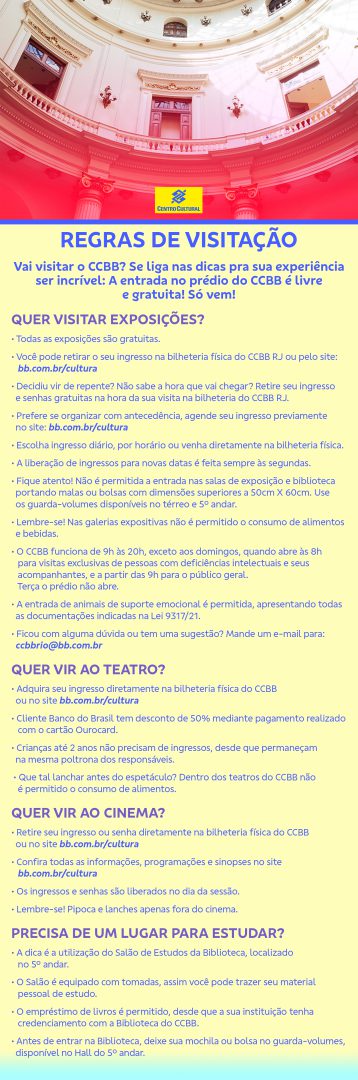 O prédio do CCBB Rio, inaugurado em 1906, foi modernizado ao longo dos anos e recebeu diversas adaptações que hoje permitem o acesso através de rampas, elevadores para o público, elevador entre o palco e camarins do teatro, corrimão nas escadas, banheiros especiais e adequações nos teatros, salas de projeção e auditórios.