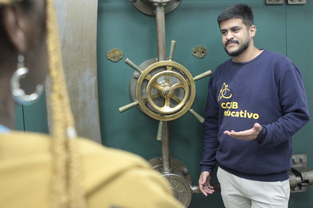 Visitas mediadas aos espaços expositivos ou prédio histórico do CCBB, elaboradas pela equipe educativa, para diálogo com o público e aprofundamento sobre a programação. As visitas visam contribuir com a experiência de estar com arte, ampliando e conhecendo novos repertórios, por meio de uma conversa cheia de trocas de saberes. A atividade atende a grupos de estudantes, professores, organizações sociais, instituições culturais e museológicas.