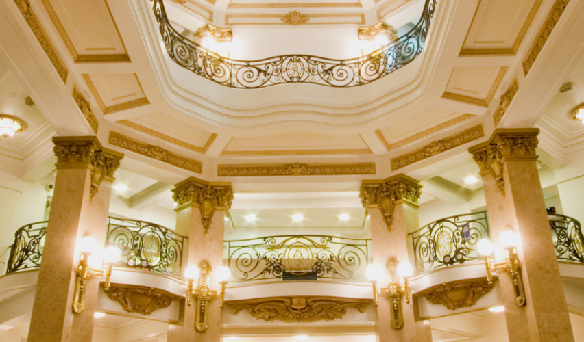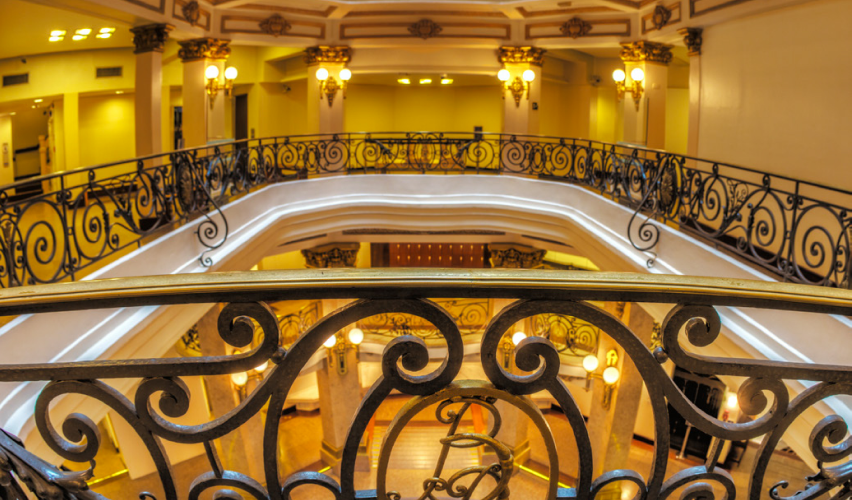 No interior, um requintado hall de entrada dá acesso ao átrio central, que conserva o piso de mosaico. Elegantes gradis de ferro, balcões de madeira trabalhada e um delicado vitral dão uma atmosfera aristocrática ao espaço verticalizado.